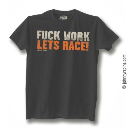 Il messaggio è molto chiaro, per noi è una filosofia quella di mandare a quel paese il lavoro per andare a gareggiare, meglio se la gara si farà con qualcosa che ha delle ruote ed un motore. Abbiamo molti amici che vorrebbero svegliarsi alla mattina salire su una moto o un'auto e dare gas, del gran gas e allora “Fuck Work Lets Race”